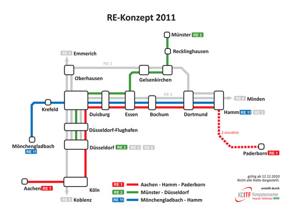 Im Dezember 2010 konnten unter dem Motto "Mehr RE für NRW" deutliche Verbesserungen im zentralen RE-Netz umgesetzt werden. Durch neue Linienführungen konnten neue Direktverbindungen geschaffen werden. Der RE 2 verkehrt seitdem von Münster über Recklinghausen und Essen weiter nach Düsseldorf. Darüber hinaus konnten Fahrgäste aus der Region Mönchengladbach/Krefeld direkt mit dem RE 11 über Essen hinaus in Richtung Hamm fahren. Die Reisezeit zwischen Mönchengladbach und Dortmund verkürzte sich damit um fast 15 Minuten. Der Abschnitt Hamm – Paderborn wurde durch den RE 1 statt wie zuvor durch die Linie RE 11 bedient. Durch den neu stündlich verkehrenden RE 11 wurde auf dem Kernkorridor im Ruhrgebiet ein angenäherter 20-Minuten-Takt im RE-Verkehr geschaffen.